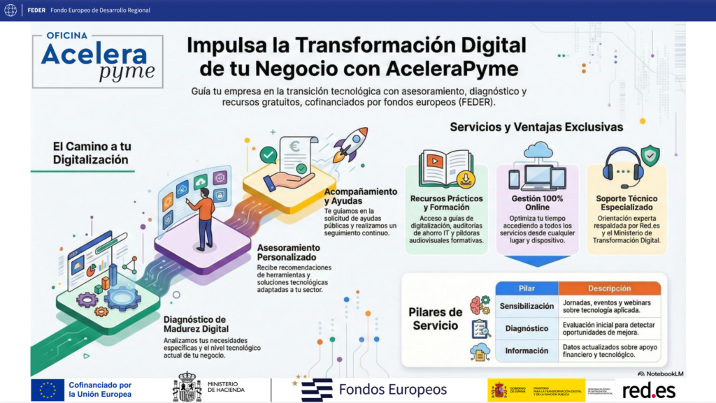 La Oficina Virtual AceleraPyme es la plataforma digital de atención, información y acompañamiento de la Oficina AceleraPyme Cooperativas Agroalimentarias de Andalucía – Almería, creada para apoyar a pymes, autónomos y emprendedores en su proceso de transformación digital.